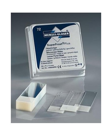 Vetrini portaoggetto Superfrost Plus con adesivo lxl 25x75 mm. conf. 72 pezzi fascia bianca bordo molato