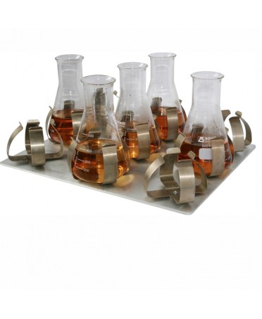 Piattaforma a 9 posti con clamps per beute da 500 ml. Dimensioni piattaforma 360x400 mm.