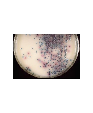 Terreno selettivo e cromogenico per la determinazione di E.coli negli alimenti (ISO 16649). E.COLI sviluppa colonie verde-blu.