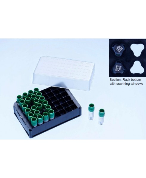 Box studiati appositamente per lo stoccaggio di tubi con sistema datamatrix. Possono contenere fino a 48 tubi Cryo.s organizzati secondo lo schema standard ANSI per le micropiastre. I campioni possono essere processati automaticamente grazie al fondo a finestre che permette la lettura diretta dei codici datamatrix dei tubi senza la necessità di levarli dal box.