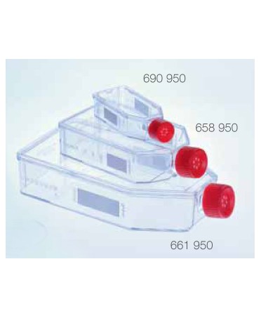 Fiasche con superficie trattata con collagene tipo 1 per colture primarie, per cellule in condizioni di crescita restrittive (in riduzione o assenza di siero), per cellule endoteliali. Sterili, Greiner Bio One serie CELLCOAT.