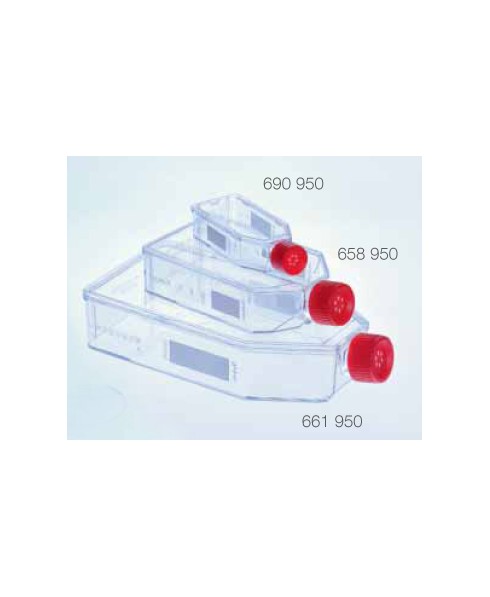 Fiasche CELLCOAT®, GREINER, collagene tipo 1 da 650 ml, 175 CM², ps, tappo a vite rosso con filtro, sacchetto 5 pezzi imballo 40