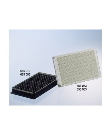 Piastre a 96 pozzetti, in polistirene, con fondo piatto e pozzetti tipo "Chimney" con trattamento TC per colture di cellule in adesione, originali Greiner Bio One, sterili.