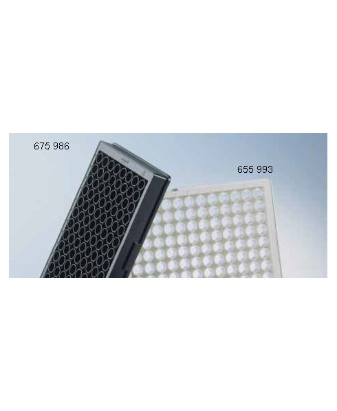 Piastre a 96 pozzetti con superficie di adesione modificata mediante trattamento ADVANCED TC, per colture in adesione di cellule particolarmente difficili, per colture primarie o per cellule in condizioni di crescita restrittive (in riduzione o assenza di siero), sterili, Greiner Bio One.
