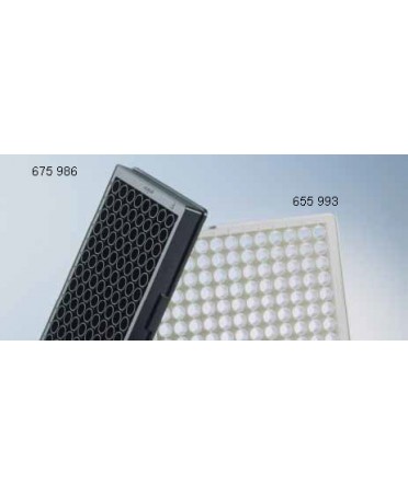 Piastre a 96 pozzetti con superficie di adesione modificata mediante trattamento ADVANCED TC, per colture in adesione di cellule particolarmente difficili, per colture primarie o per cellule in condizioni di crescita restrittive (in riduzione o assenza di siero), sterili, Greiner Bio One.