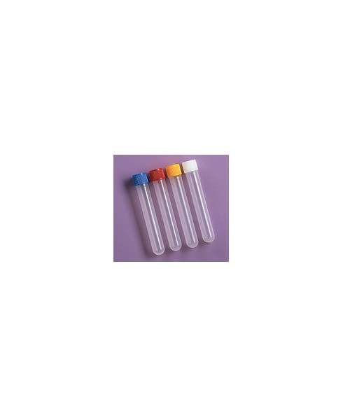 Provette in plastica monouso con fondo cilindrico e tappo a vite.