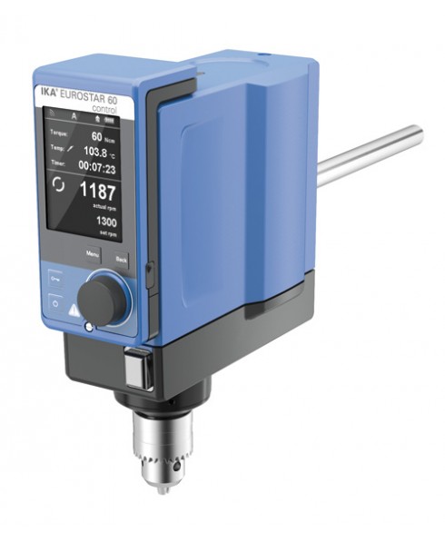 Agitatore ad asta IKA da laboratorio universale dotato di unità di controllo senza fili, allontanabile, e con display a cristalli liquidi TFT, multilingua, con visualizzazione delle impostazioni e dei codici di errore. Strumento in grado di lavorare con volumi trattabili da 40 litri  a 100 litri di acqua e capace di adattare automaticamente la velocità, mediante tecnologia a microprocessore, in un intervallo tra 30 e 2000 rpm (1300 rpm per E100 Control, confrontando la velocità dell’asse di rotazione con il valore di velocità impostato, per garantire agitazione costante anche in caso di variazioni della densità del liquido. Equipaggiato con una porta seriale RS 232 e una USB per il controllo e la documentazione di tutti i parametri. Visualizzatore dell’andamento della coppia di torsione per la misura di cambiamenti di viscosità.