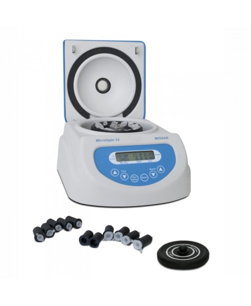 Microcentrifuga Microspin 12, viene fornita completa di rotore per 12 microprovette da 1,5/2,0 ml (MSR-12) , 12 adattatori per microprovette da 0,5 ml (A-05) e 12 adattatori per microprovette da 0,2 ml (A-02).