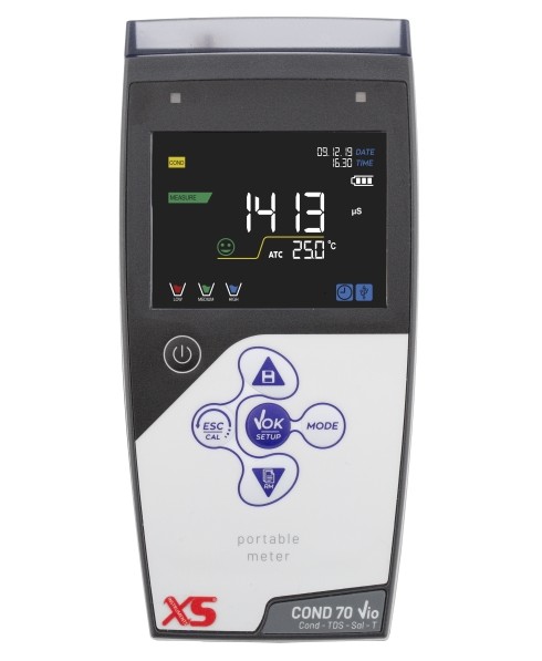 Conduttimetro professionale portatile COND 70 VIO dotato di tripla alimentazione (batteria, PC, rete elettrica) con innovativo display ad alta risoluzione a colori, per una eccellente visualizzazione dei dati in tutte le condizioni di luminosità, grazie anche alla possibilità di regolare automaticamente e manualmente contrasto ed illuminazione del display.