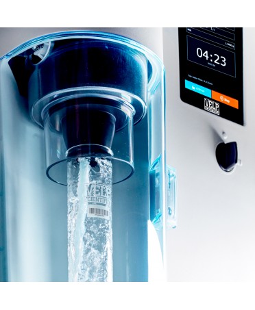 L' UDK 149 è dotato dell'esclusivo condensatore in titanio VELP, progettato e brevettato per garantire uno scambio termico efficiente e un basso consumo di acqua. Assicura una temperatura del distillato sempre al di sotto del valore soglia (35 °C), come indicato nel metodo Kjeldahl, senza perdite di Azoto.
