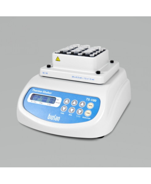 Thermo-Shaker TS-100 consente l'agitazione e il controllo della temperatura su campioni in microprovette e piastre per PCR. Questo modello ha la possibilità di riscaldare e agitare campioni tra 5° C sopra ambiente e +100° C e di impostare temperature fra +25° e +100°C con estrema stabilità di temperatura e veloce raggiungimento dei parametri impostati.
