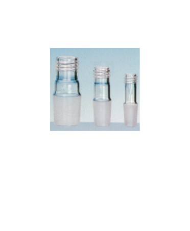 Raccordi adattatori con una estremità filettata e una con cono a smerigliatura normalizzata. Vetro borosilicato.